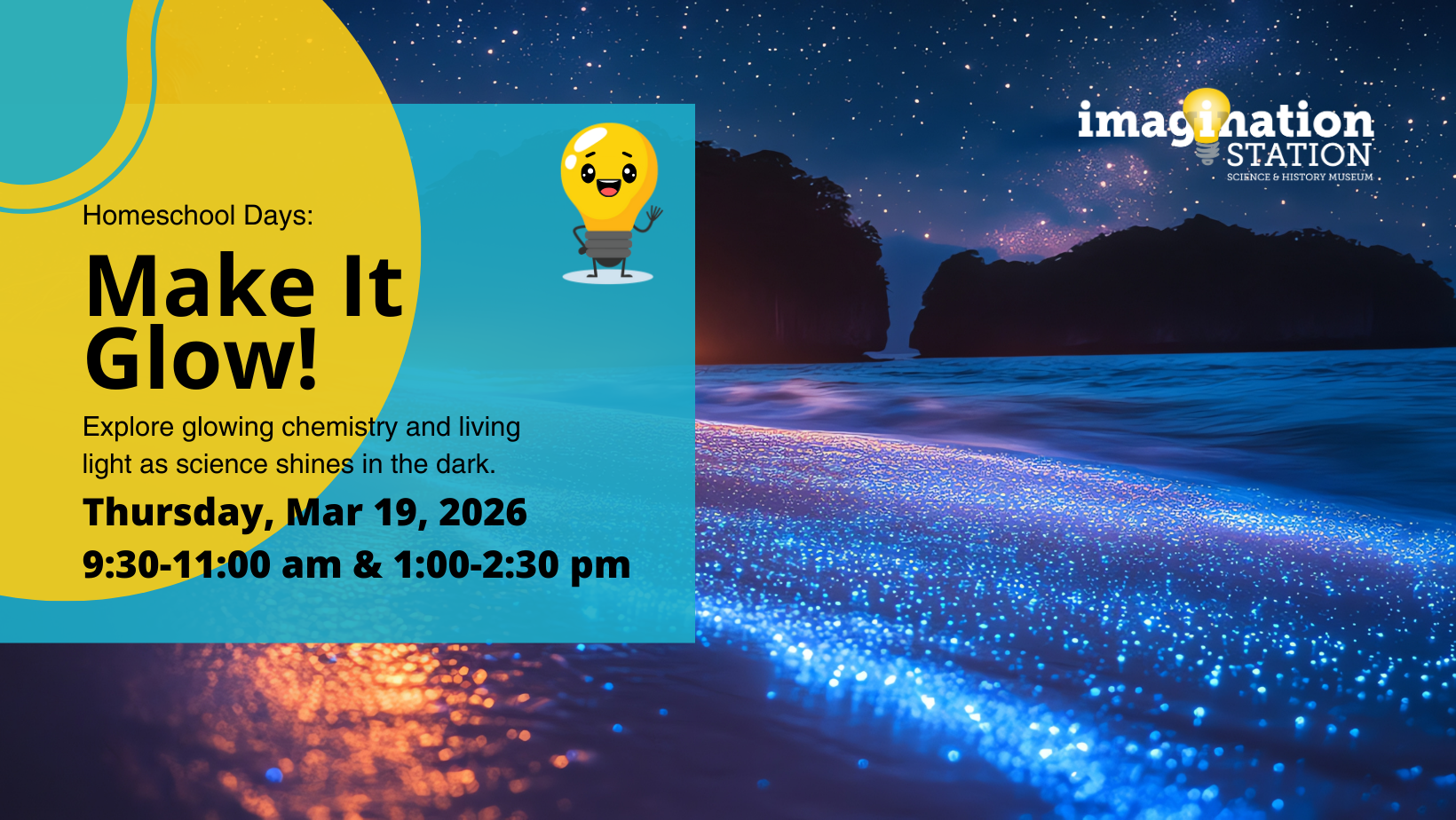Imagination Station 224 Nash St SE, Wilson, NC, United StatesMake It Glow! From glowing chemicals to glowing living things, students investigate the science behind things that glow in the dark. This program explores both chemical and biological luminescence. Students…