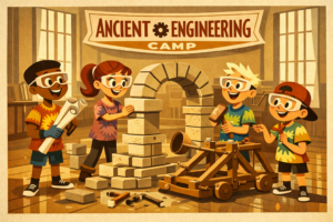 Explore ANCIENT TIMES ENGINEERING at Imagination Station. Step back in time and discover how ancient civilizations used science and engineering to shape the world around them. Campers will experiment with simple machines, build and test ancient technologies, and solve hands-on challenges inspired by real archaeological discoveries. History comes alive as kids explore how innovation helped ancient people survive, build, and thrive.
